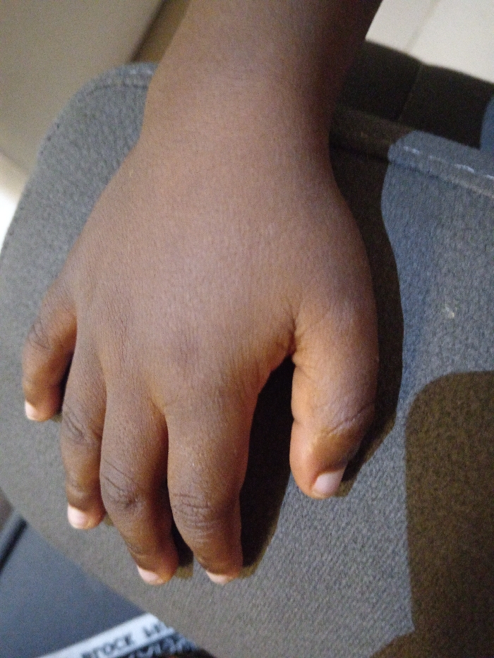 A close-up image displays a human left hand, characterized by dark brown skin and plump features consistent with a child's hand