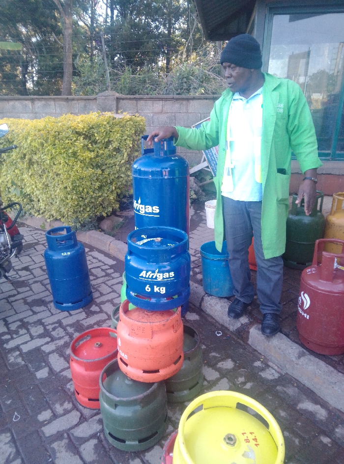 The image depicts an outdoor commercial scene in Karai ward, Kenya, featuring a male individual amidst numerous liquefied petroleum gas (LPG) cylinders