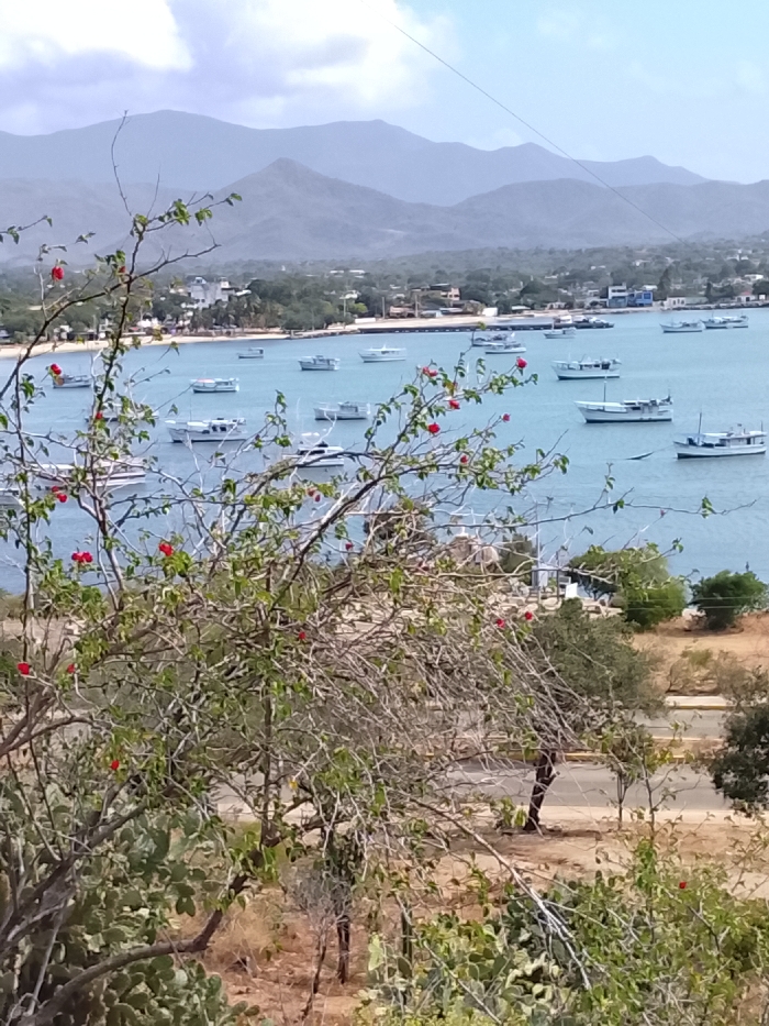 A scenic view overlooking a bay dotted with numerous boats. A coastal town lines the shore, backed by a mountain range fading into the horizon under a cloudy sky. A foreground filled with a flowering tree, bare branches and green foliage, alongside arid vegetation and a road cutting through the landscape. The scene appears captured from an elevated vantage point.