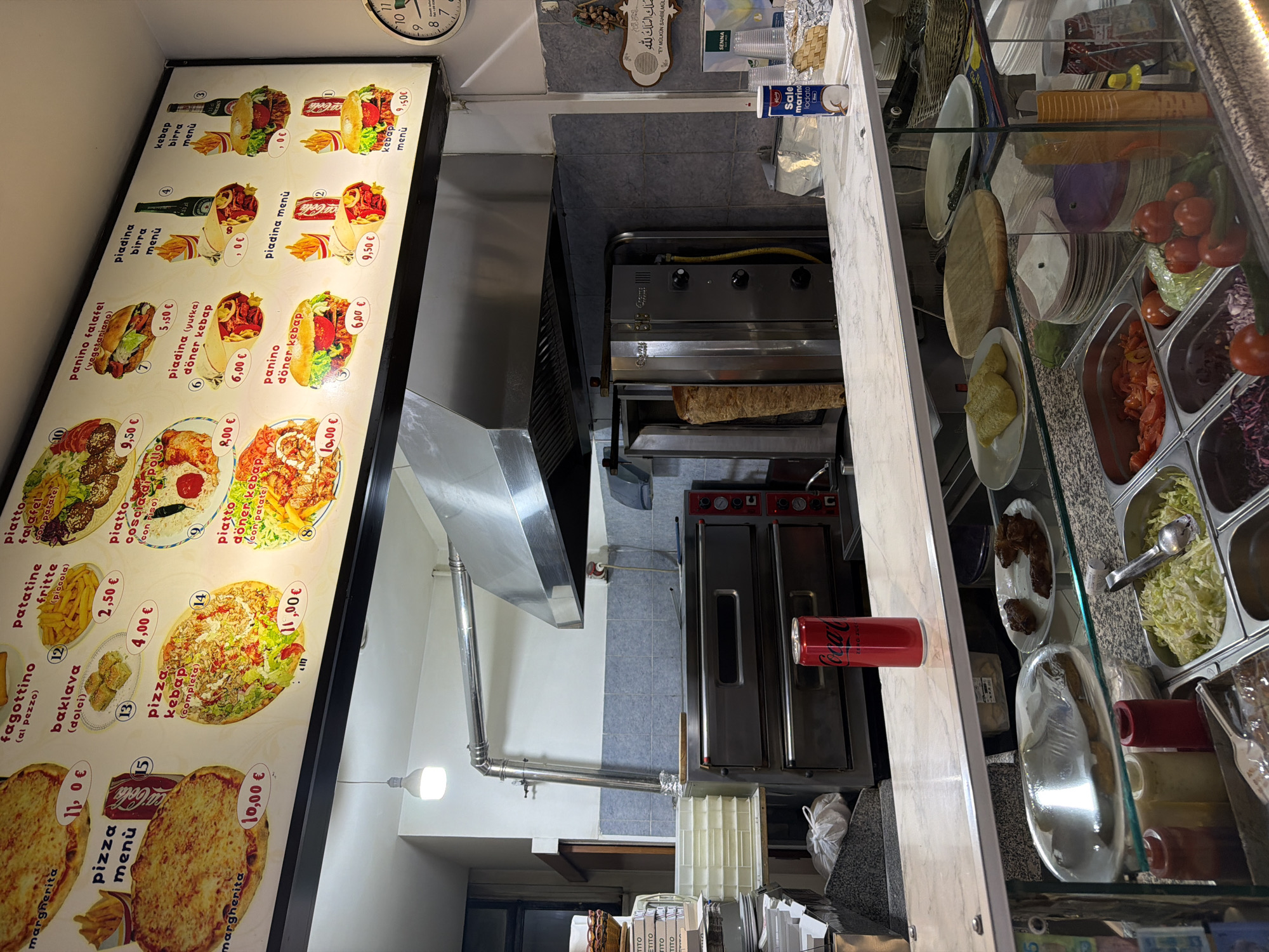 The image displays the interior of a fast-food establishment, specifically a kebab shop or pizzeria, located in Milan, Italy