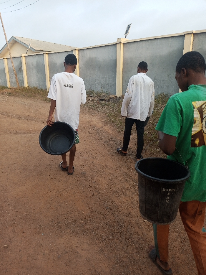 Three young men walk away from the viewer on a dirt road. The man in the foreground wears a green t-shirt and brown pants, carrying a bucket with "HAPPY FAN" printed on it. Another man, in the middle, wears a white long-sleeved shirt and black pants. The third, furthest from the camera, carries a black basin and wears a white t-shirt with "Support your MAMA" printed on the back. A concrete wall borders the road, and a house is visible behind it.