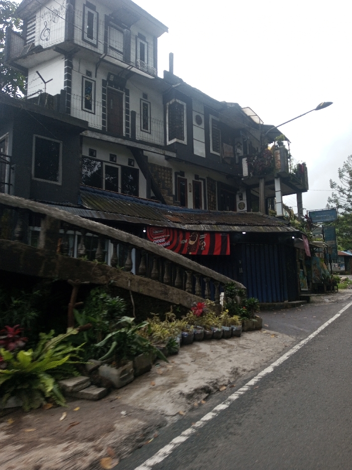 The image displays a multi-story building situated alongside a paved asphalt road in Bangtsho, Bhutan, under an overcast sky