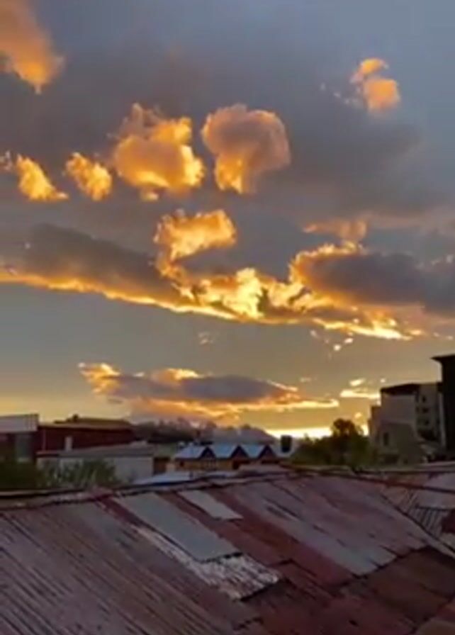 wide shot of a sunset as viewed from above a corrugated metal roof. The sky is filled with gray and orange clouds, and the mountains can be seen in the distance. In the foreground, there is a corrugated metal roof. In the mid-ground, there are buildings and trees. The video is stable and the lighting is natural.