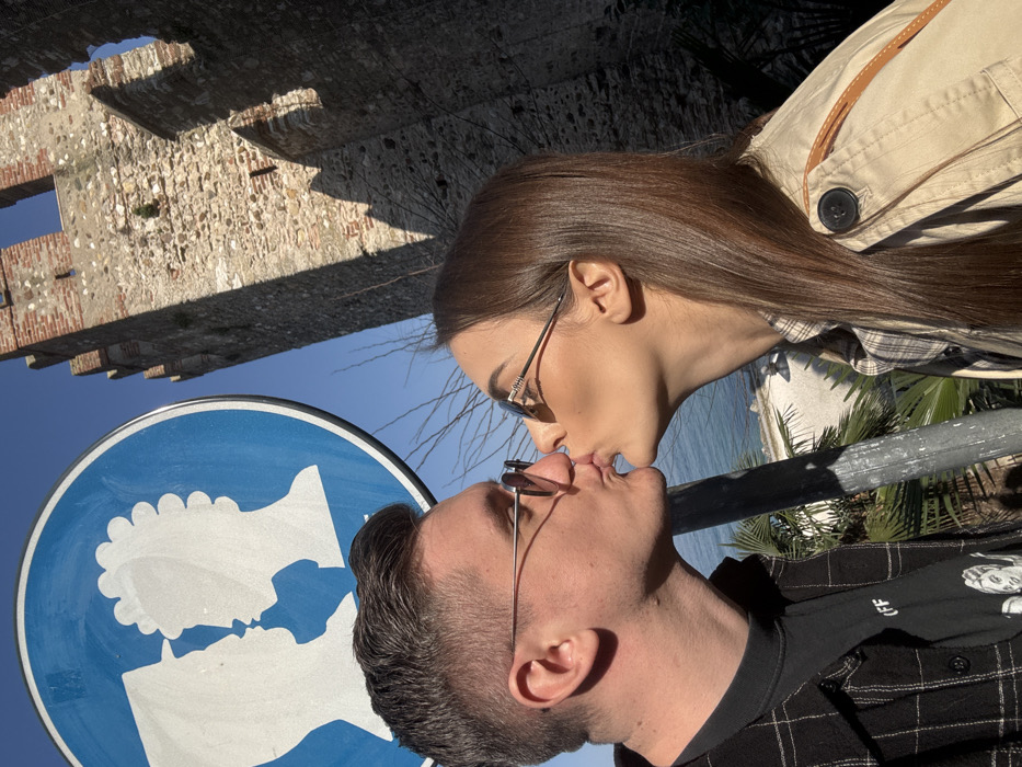 The image depicts two young adults, a male and a female, engaged in a kiss. The male, positioned on the left, wears a dark plaid shirt over a dark t-shirt with a partial white graphic and sunglasses. The female, on the right, wears a light-colored trench coat over a plaid shirt and sunglasses, with long brown hair. Their faces are in profile, with lips touching. Directly above and slightly behind them is a prominent circular blue sign featuring two white silhouetted profiles, one male and one female, facing each other in a kissing posture, mirroring the couple's action. In the background, under a clear blue sky, are sections of the historic Scaliger Castle in Sirmione, Italy, identifiable by its rough-hewn stone construction and crenellated battlements. The castle walls exhibit strong shadows, indicating direct sunlight. Below the castle and behind the couple, a vast expanse of blue water, consistent with Lake Garda, is visible. Green vegetation, including palm fronds, and sparse bare branches are present in the mid-ground between the water and the castle. A gray metallic pole runs vertically through the lower portion of the frame.