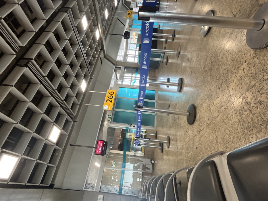 This image depicts a deserted passenger boarding gate area within São Paulo/Guarulhos International Airport (GRU) in Guarulhos, Brazil. The primary subject is Gate 266, identified by a yellow overhead sign displaying "Gate 266" alongside an airplane icon. The environment features a light-colored, speckled tiled floor and a grid-patterned ceiling composed of square recesses with integrated square light fixtures. The walls and structural elements are predominantly grey, complemented by glass panels and sections of light blue-framed doorways. In the foreground, a row of empty, grey airport-style seating with dark padded cushions is visible on the left, extending from the bottom left corner. Directly opposite these seats, a queuing system is established using numerous silver stanchions with black circular bases. These stanchions support blue retractable belts, each prominently displaying the word "decolar" in white text. This queue leads towards the light blue double doors of Gate 266, which appear closed. Further into the terminal, another gate sign for "265" is partially visible. A small black monitor, suspended from the ceiling on the left, displays "GRU WIFI" in red text. To the far left, behind the seating, a grey wheeled hand truck is parked near a glass wall. No individuals are present in the scene, and no actions or interactions are depicted. The area appears prepared for passenger processing but is currently unoccupied.