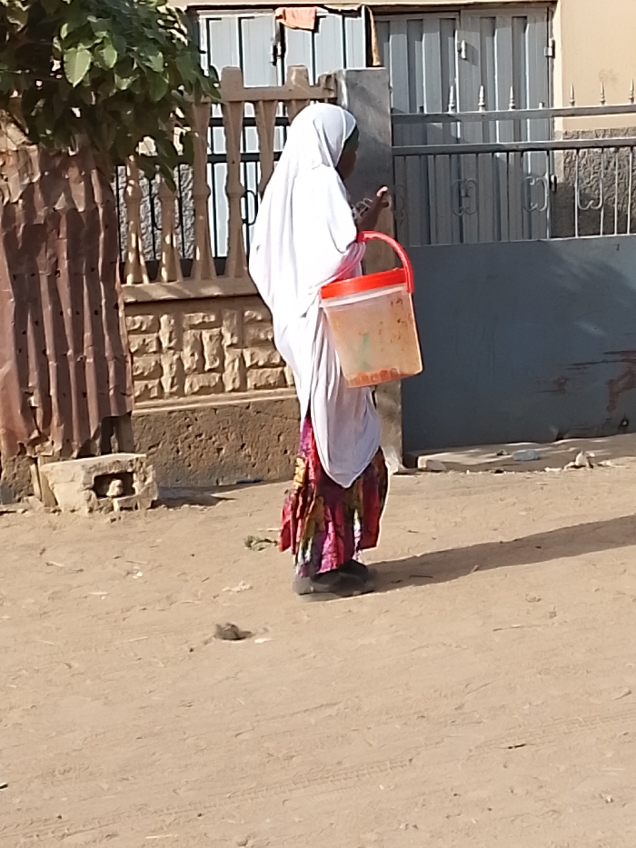A woman wearing a white headscarf and colorful skirt walks on a dirt road carrying a clear bucket with a red handle. The bucket appears to contain small, round objects. The woman is walking past a concrete wall and a metal gate. A corrugated metal structure stands to the left. The scene is bathed in bright sunlight.