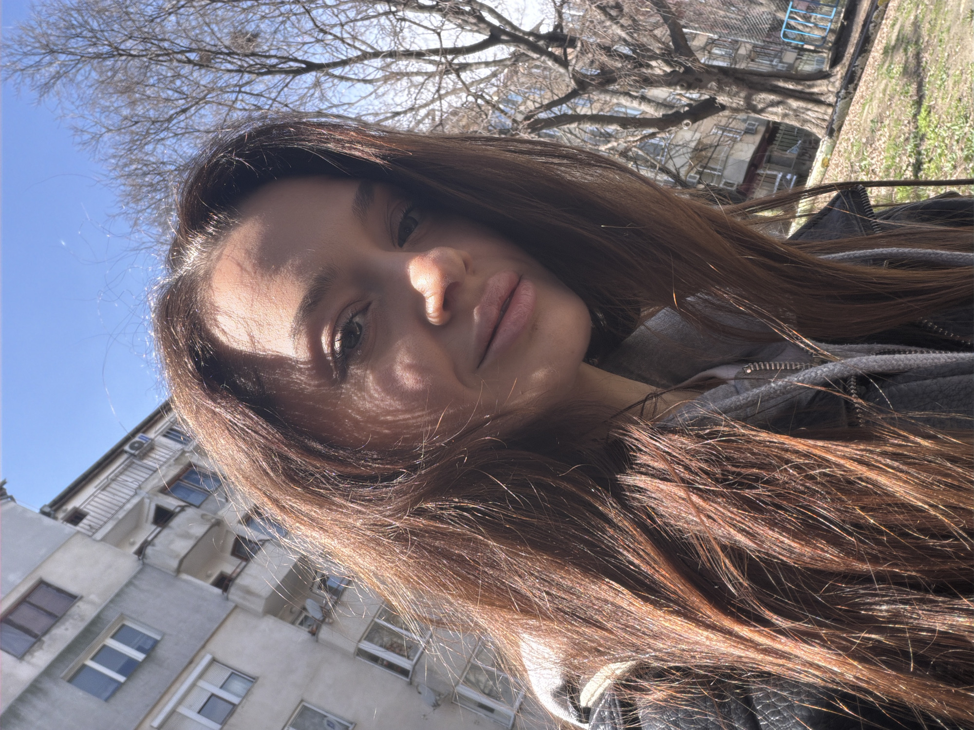 The image displays a sunlit close-up selfie of a female individual in an outdoor urban environment within Varna, Bulgaria