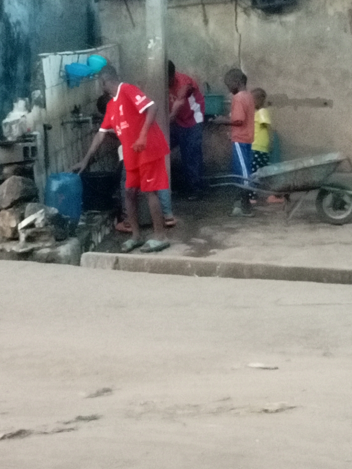 Several people stand near a water source. A person in red sports attire fills a blue container. Another figure, also in red, stands nearby. Two younger individuals are visible to the right, one wearing an orange shirt and the other a yellow one. A wheelbarrow sits next to them on the paved ground. The setting appears to be an outdoor area with a building or wall in the background.