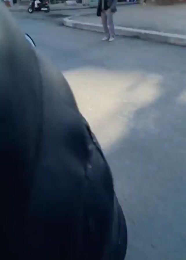 The video appears to be shot from the perspective of someone riding a moped or motorcycle on a paved street in a city or town