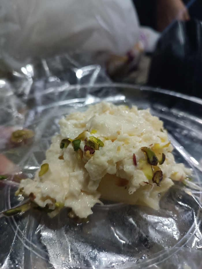 - "A single serving of an off-white, creamy dessert is centered on a crinkled clear plastic film, which rests on a dark, reflective platter" by FM-Dj8kx1, licensed under CC BY 4.0