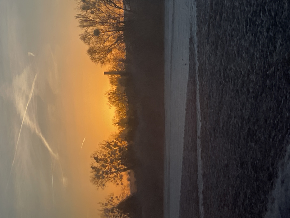 A hazy, sunlit landscape features a bright yellow sky transitioning to a pale grey. Silhouetted trees with round growths line the horizon, with a lone pillar interrupting the treeline. Contrails mark the sky, indicating airplane activity. A textured grey foreground suggests a field or ground cover, adding depth and contrast to the ethereal scene.
