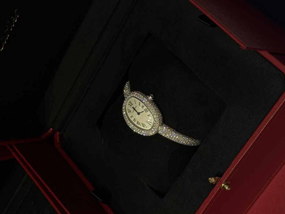 A lavish Cartier watch rests inside its box