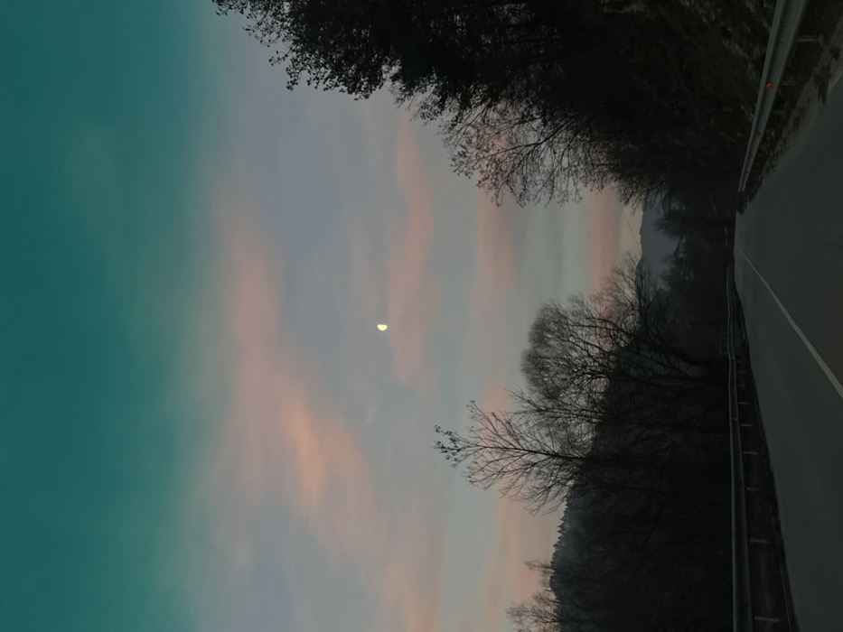 The image depicts a rural road scene within the city of Rustan, Bulgaria, under a twilight sky, featuring a crescent moon. The sky transitions from a deep teal at the zenith to a lighter blue-grey, streaked with horizontal pink clouds. A crescent moon, illuminated on its right side, is positioned in the upper-middle left of the frame. An asphalt road, marked by a solid white center line, recedes into the distance, curving slightly to the right. Silver guardrails line both sides of the road; the right guardrail features small orange reflectors. Bare, deciduous trees, indicative of late autumn or winter, flank the road. On the left, a darker, forested hillside rises behind sparser trees. On the right, a denser line of trees borders an embankment. Distant, dark hills or mountains are visible in the background, partially obscured by haze. No people, vehicles, or specific architectural structures are present within the frame.
