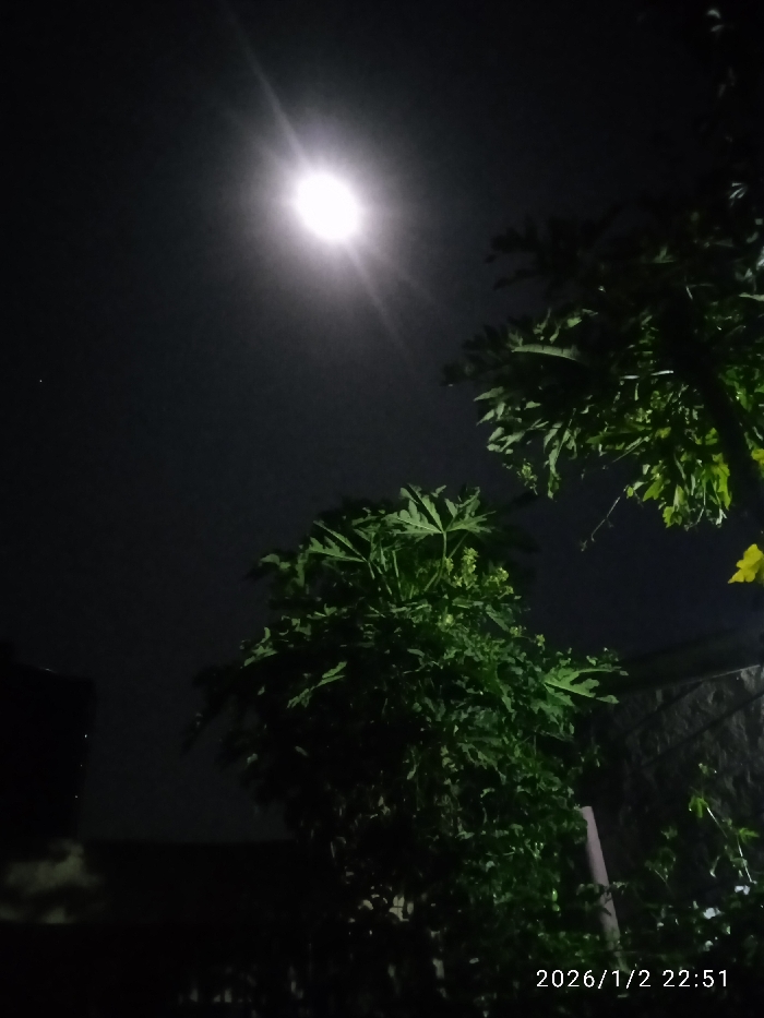 A night scene shows a bright moon illuminating the dark sky above a cluster of trees. The foliage is dense and lush, suggesting a tropical environment. Silhouetted buildings are visible in the lower-left. The image has a dark, moody feel with high contrast between the bright moon and the surrounding darkness. A timestamp in the lower-right corner reads "2026/1/2 22:51".