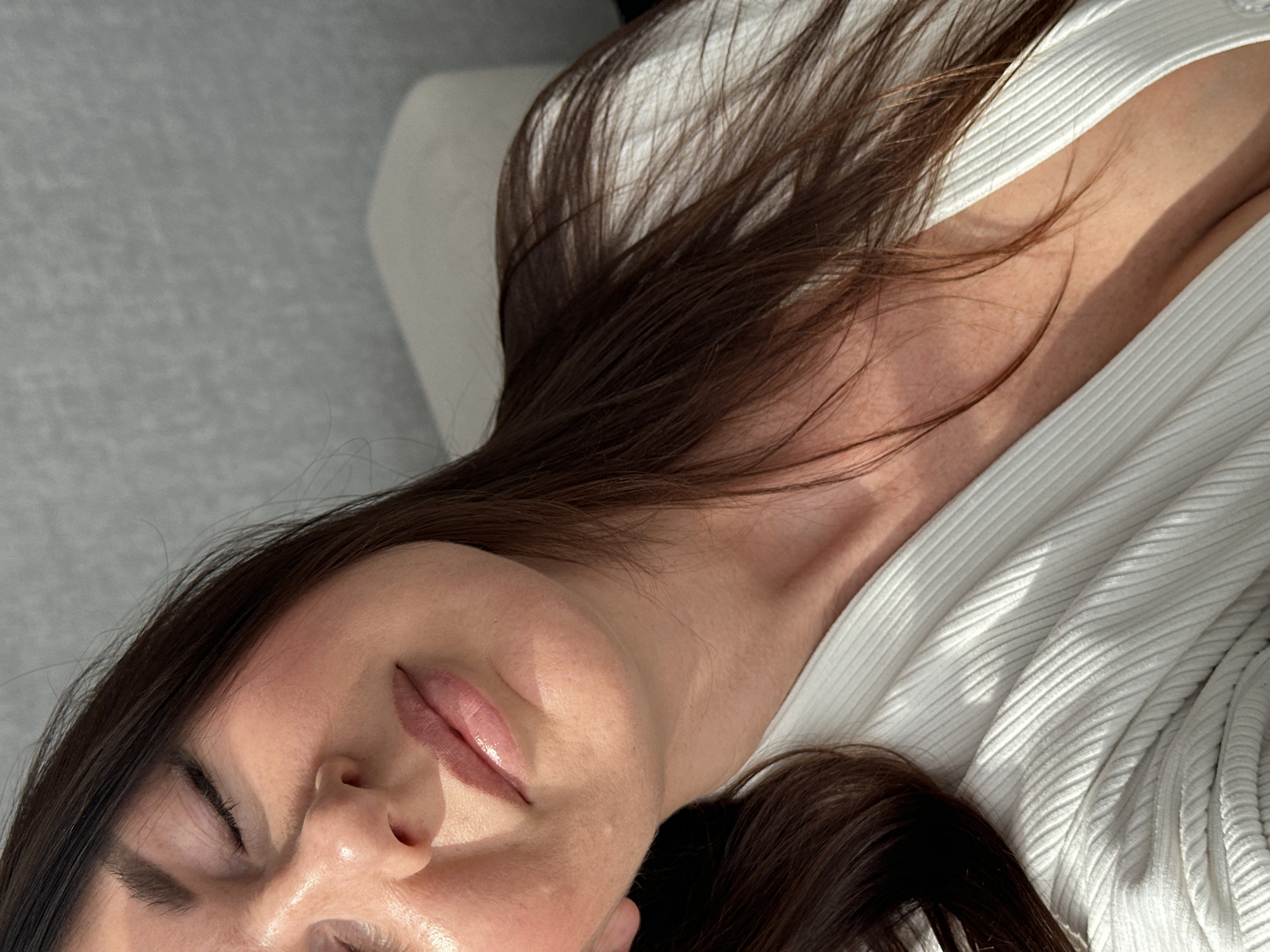 A woman is lying down, possibly on a bed or sofa. She has dark hair, fair skin, and her eyes are closed. She is wearing a white ribbed garment. The background appears to be a light gray or white surface. The location is not discernible from the image.