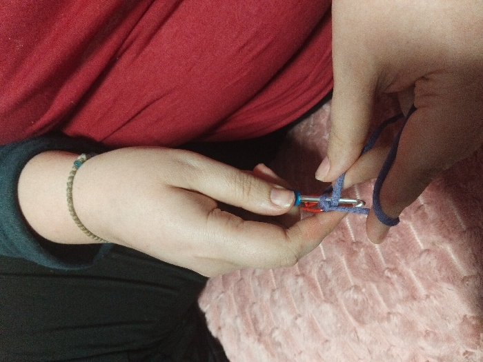 The image displays a close-up, top-down view of two hands engaged in crocheting, located in Pirdop, Bulgaria. The left hand, wearing a thin, braided, tan-colored bracelet with a small blue bead on the wrist, holds a metal crochet hook with a blue tip. An orange plastic stitch marker is clipped onto a loop on the hook. Light purple yarn is actively being worked by both hands, with the right hand managing the yarn feed. The individual's left forearm is partially visible, covered by a dark teal long-sleeved garment. A section of red fabric is present on the right side of the frame. The hands and crochet work rest upon a textured, light pink, plush fabric, consistent with a pillow or blanket.