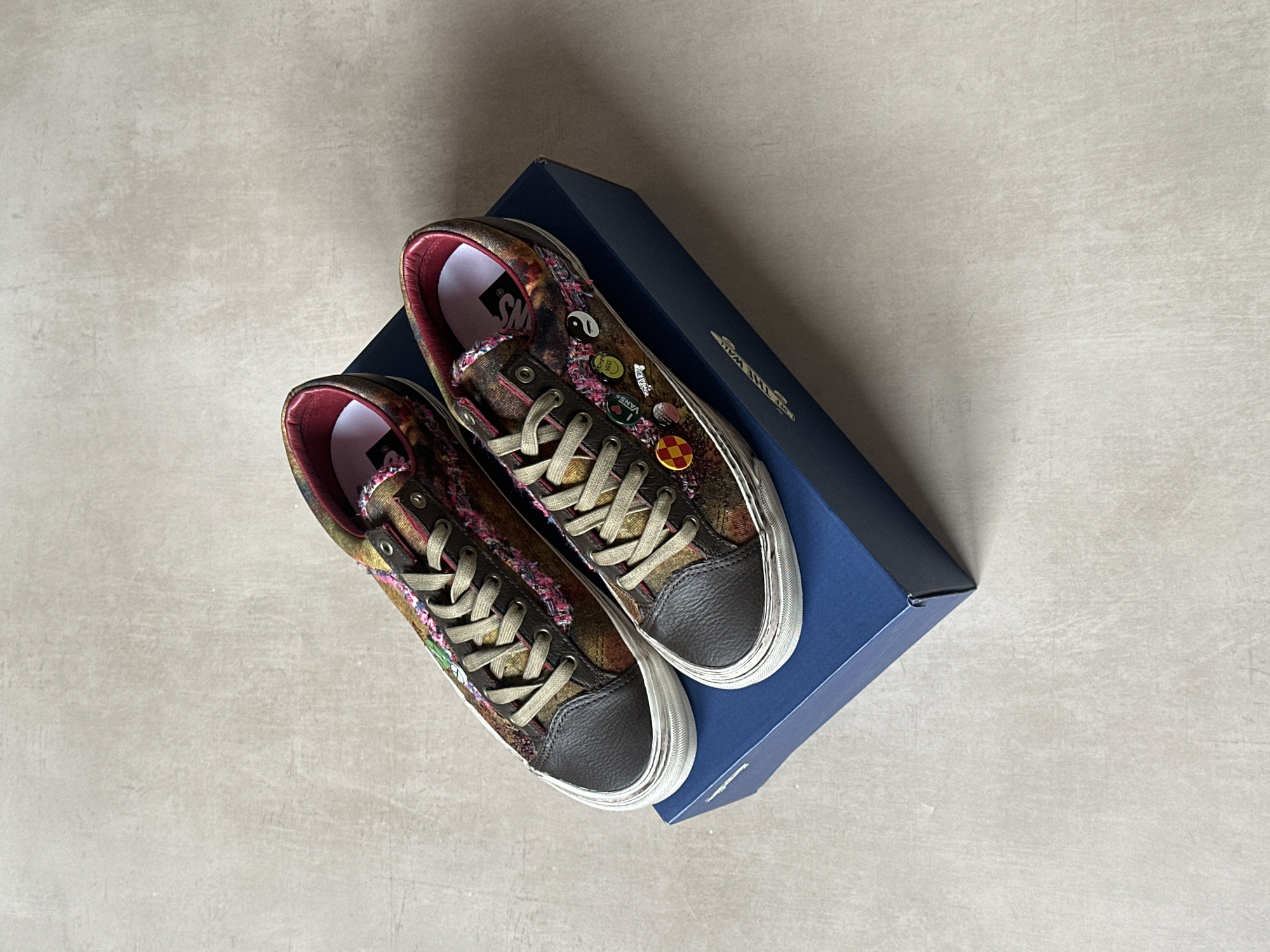 A pair of Vans low-top sneakers rests on a dark blue shoebox. The sneakers feature a multi-colored fabric upper with distressed textures in brown, green, pink, and gold hues, complemented by dark brown leather toe caps and tan laces. The interior lining is burgundy, and the white rubber soles exhibit a ribbed texture along the perimeter. Multiple circular enamel pins adorn the outer sides of both shoes, depicting symbols such as a green peace sign, a black and white yin-yang, a red and yellow checkerboard, and several "VANS" logos. The shoebox displays "OFF THE WALL" in gold lettering on its visible side. The items are positioned on a light, textured, monochromatic surface. The specific location within the city of London, United Kingdom, cannot be determined from the visual information provided.