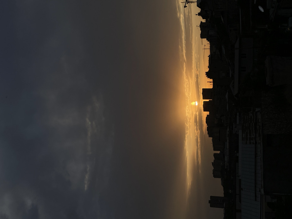The image displays a panoramic view of Yerevan, Armenia, at sunset. The upper two-thirds of the frame are dominated by a dense, dark cloud cover. Below this, a horizontal band of orange-yellow light emerges from the horizon, where the sun, appearing as a bright, vertically elongated orb, is partially obscured by clouds. The cityscape of Yerevan is silhouetted against this bright horizon. The skyline consists of numerous multi-story buildings, including prominent block-like structures, with an active construction crane visible on the far right. The immediate foreground shows dark, undefined rooftops and structures. No people, specific actions, or interactions are discernible.