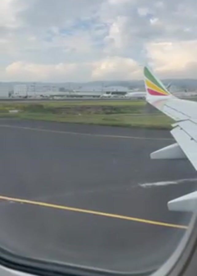 From the perspective of an airplane window, an aircraft wing with the Ethiopian flag on its wingtip is visible on the runway