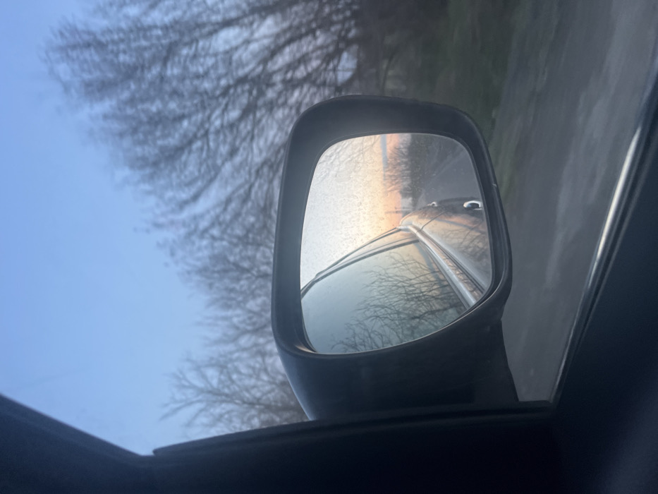 The image captures a view from inside a moving vehicle, looking out the driver's side window. A dark gray car door frame occupies the left and bottom-left portions of the frame. Centrally positioned is a dark, rectangular exterior rearview mirror, appearing somewhat dusty or smudged. The mirror's reflection shows the rear passenger side of the vehicle, which is dark gray. Behind the reflected vehicle, a road surface is visible. In the distance within the mirror, a large body of water is discernible, reflecting warm orange and pink hues indicative of either sunrise or sunset. The horizon behind the water is lined with bare trees or shrubs. Outside the car, directly visible above and to the right of the mirror, is a clear, light blue sky. Numerous bare deciduous trees with thin branches are silhouetted against the sky, showing motion blur, which suggests the vehicle is in transit during a cold season like winter or early spring. A strip of dark green-brown land, likely the roadside, is visible below the blurred trees on the far right. This scene is located on a road in or near Burgas, Bulgaria, adjacent to a significant body of water, most probably the Black Sea or one of the large lakes such as Lake Burgas or Lake Mandra, given the reflected light and landscape. No individuals are visible in the frame.