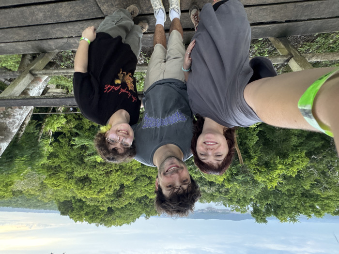 Three people pose for a selfie outdoors. On the left, a person with glasses and dark hair wears a black t-shirt and green pants. In the middle, a man with curly dark hair wears a grey t-shirt and khaki pants. On the right, a person with red-brown hair wears a grey dress. All three are smiling. The background shows a green forest and a body of water. A green wristband is visible on the right. The photo seems to be taken on a wooden deck or platform. The image is rotated 180 degrees.