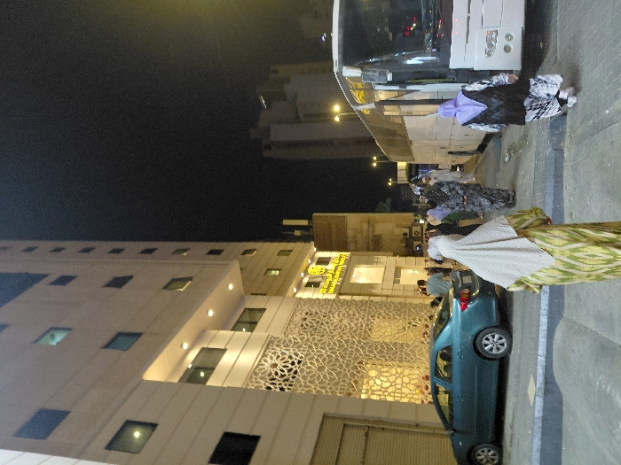 A building with lit windows and an ornate facade stands next to a street at night. A blue car is parked in front of the building. Several women in headscarves are walking on the sidewalk alongside a bus. The sky is dark.