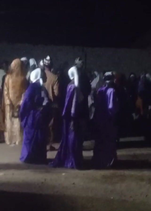 The video depicts a group of people standing outside at night. The people are wearing a variety of clothing including purple robes, brown robes, and white head coverings. It is unclear what the people are doing or why they are gathered. The video is dark and grainy, making it difficult to see details.