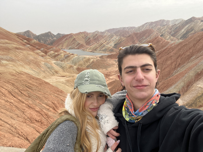 The image depicts a selfie of two individuals, a male and a female, situated in the Zhangye National Geopark in Zhangye, China