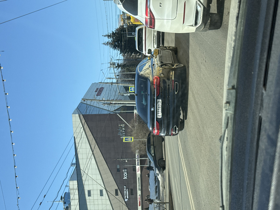The image depicts a daytime street scene in Rusanovo, Russia, under a clear blue sky. The perspective is from inside a vehicle, looking forward through a dashboard, which is visible across the bottom of the frame. The road surface is asphalt, appearing dusty. In the immediate foreground, to the right, is the rear section of a white SUV, partially obscured by the camera vehicle. In the midground, a black BMW 7-series sedan, bearing Russian license plate "E111EO 76", is positioned centrally, exhibiting dual chrome exhaust tips. Behind the BMW, a white sedan is visible. To the left of the BMW, a dark-colored sedan is positioned further down the road, possibly turning. All vehicles appear to be in traffic, either stopped or moving slowly. To the left of the road, a sidewalk area is visible with patches of snow. A metal pedestrian barrier runs along the sidewalk. Several indistinct human figures are discernible on the sidewalk near the snow. Multiple yellow A-frame pedestrian crossing signs are present. Dominating the left background is a large, multi-story commercial building with a modern, angular design featuring a facade of light-colored panels, dark brown sections, and extensive glass. Visible signs on the building include "Kari" (a shoe retailer), "РОСТОВСКАЯ ФИНИФТЬ", "ИМПЕРИЯ" (Imperia), and "ВОЛЖСКИЙ". Overhead, numerous power lines and utility cables crisscross the sky, and a string of decorative lights is suspended horizontally across the upper portion of the frame. Bare deciduous trees and several coniferous trees are visible in the far right background, behind the vehicles.