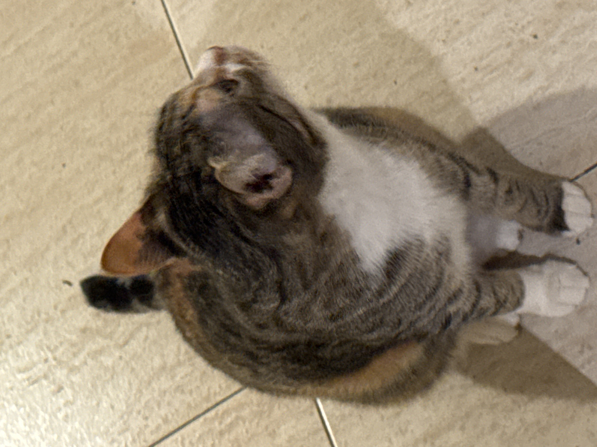 - "A domestic cat, exhibiting a tabby coat with brown, grey, and subtle orange markings, sits on a light beige tiled floor" by FM-YBu8y1, licensed under CC BY 4.0