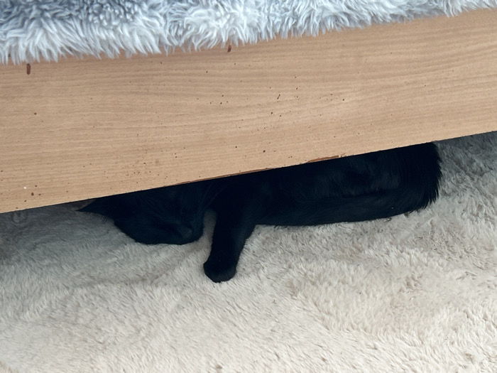 An indoor scene in Hlybokaye, Belarus, depicts a black feline subject resting on a light-colored, shaggy floor rug. The animal is partially concealed beneath a light-brown wooden furniture element, likely a bed frame. The visible portion of the cat includes its head, with closed eyes, and one forepaw extending onto the rug. A textured, light-grey fluffy material is visible directly above the wooden panel, indicating a bed or similar upholstered object. The wooden surface exhibits minor dark speckling.