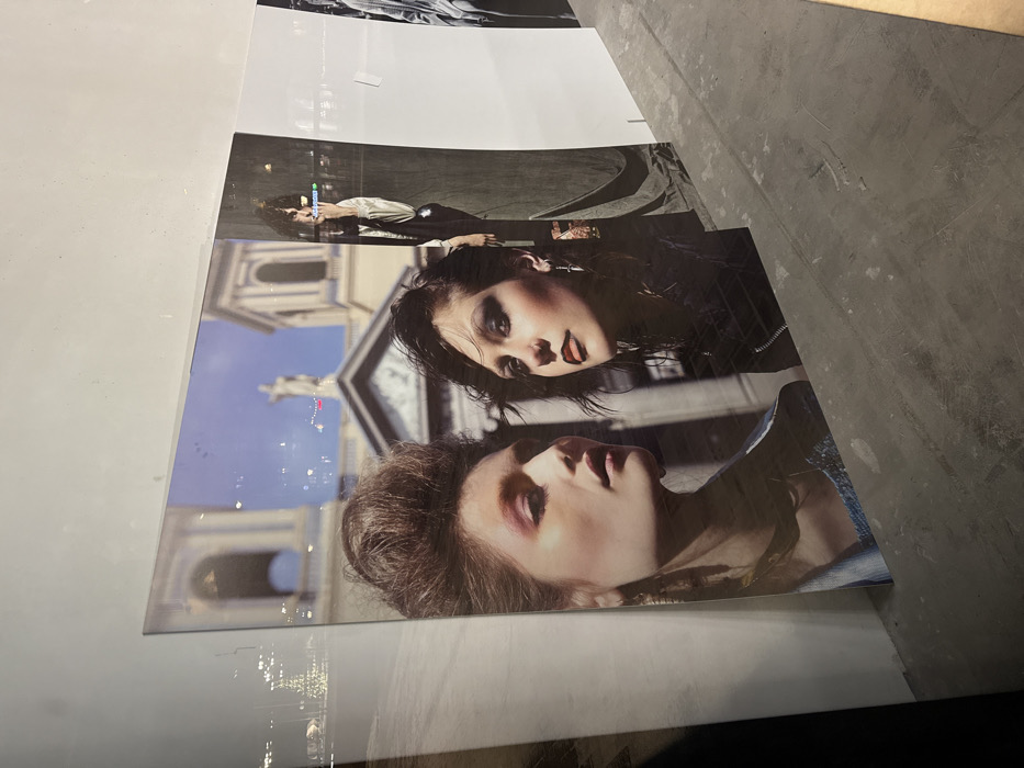 Several photographs are arranged on a reflective surface. The closest image features two women against a backdrop of a classical building. The woman in the foreground has light brown hair and wears a light-colored outfit. Above her, another woman with dark hair and a leather jacket is depicted. Further back, a monochrome image shows a person lying down. Other photos, partially visible, are stacked behind. The reflective surface and angled perspective create a layered visual effect.