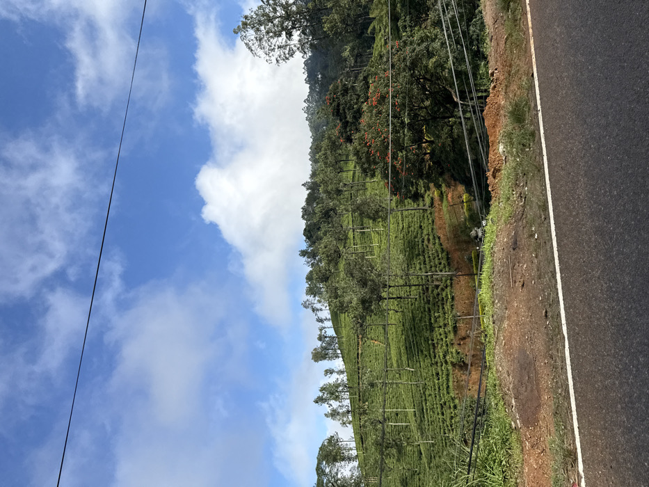 Lush, green tea plantation cascades down a hillside under a partly cloudy blue sky. Regular rows of tea bushes stretch into the distance, punctuated by taller trees providing shade. Power lines diagonally traverse the frame, adding a linear element against the organic landscape. A narrow asphalt road with a white dividing line runs along the edge, bordered by grassy and earthy terrain.