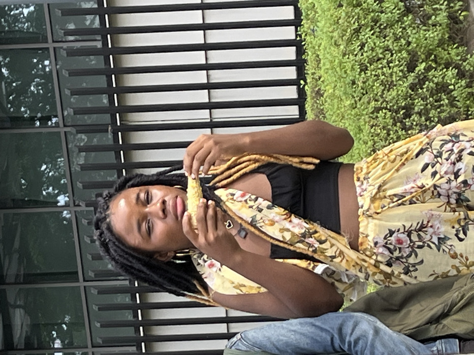 An individual, appearing to be a young female, is depicted holding and consuming a piece of corn on the cob. She has dark skin, black dreadlocks with lighter ends, and is wearing large gold-colored hoop earrings. Her attire consists of a black crop top and a yellow, floral-patterned skirt or trousers, with a matching floral fabric draped over her left shoulder. A heart-shaped pendant is visible on her chest. To her left, partially visible, is another individual wearing a blue denim jacket over a green garment. The background features a dark vertical bar fence or railing, behind which a building with reflective glass windows is visible. Green shrubbery borders the bottom right of the frame. The scene is located outdoors in the city of Itirin, Nigeria.