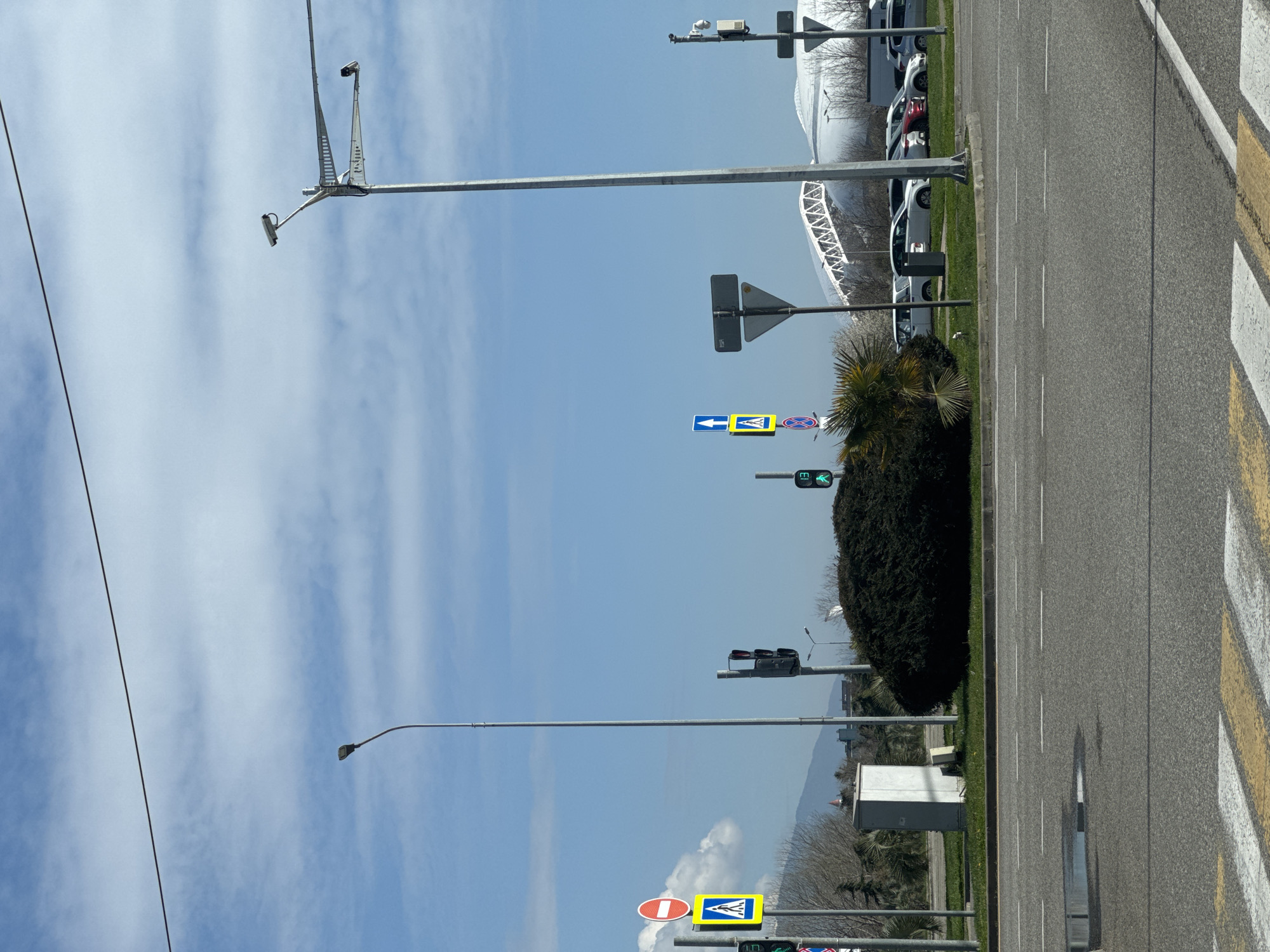 The image depicts an urban street intersection in Sirius, Russia, under a clear blue sky with scattered white clouds. In the foreground, an asphalt road displays white dashed lane markings and a yellow-and-white striped pedestrian crossing. A small puddle is visible on the asphalt. Various street furniture populates the scene. Multiple grey metal poles support streetlights, traffic signals, and road signs. One streetlight pole features a single lamp, while another tall pole on the right is equipped with two surveillance cameras mounted on extensions and an additional sensor or camera lower down. Traffic lights are visible, with one showing a red signal and another displaying a green pedestrian signal with a "13" second countdown. Road signs include a "No Entry" sign (red circle with white bar), a "Pedestrian Crossing" sign (blue square with yellow diamond and white figure), and an "Ahead Only" sign (blue square with white arrow). A landscaped median strip separates road sections, featuring a large, dense, dark green trimmed bush and a smaller palm tree. Green grass is also present. A grey utility box stands on the left side of this median. In the mid-background, a large, white, domed stadium-like structure with a visible white arched truss roof dominates the skyline. A row of parked vehicles, including white, red, and grey cars, is visible behind the median strip on the right. Distant mountains are faintly visible in the far background. No individuals are present in the scene.
