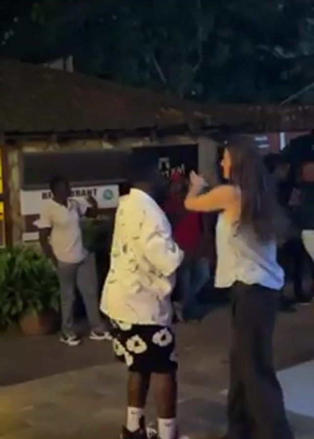 two people dancing outside. A man in a white patterned shirt and black shorts is holding hands with a woman in a white tank top and gray pants as they move together. Other people are standing around watching. There is a building in the background with a sign that says "Restaurant". The lighting is dim, suggesting it is evening or night.