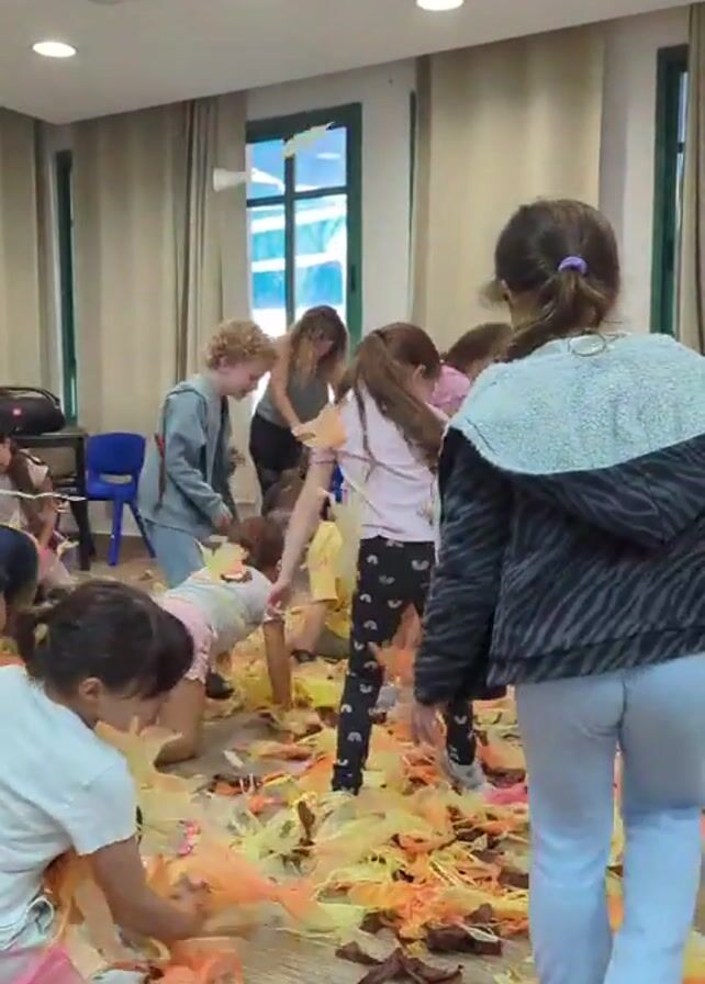 In a brightly lit, rectangular room with beige-toned walls and a beige floor, a group of about ten children are engaged in a playful activity, scattered across a floor covered in what appears to be orange and yellow shredded material