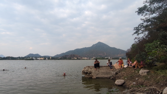 The image displays a scene at a large body of water, likely a lake or tank, in Tiruvannamalai, India, with a prominent mountain range, identifiable as Arunachala, dominating the distant background under an overcast sky