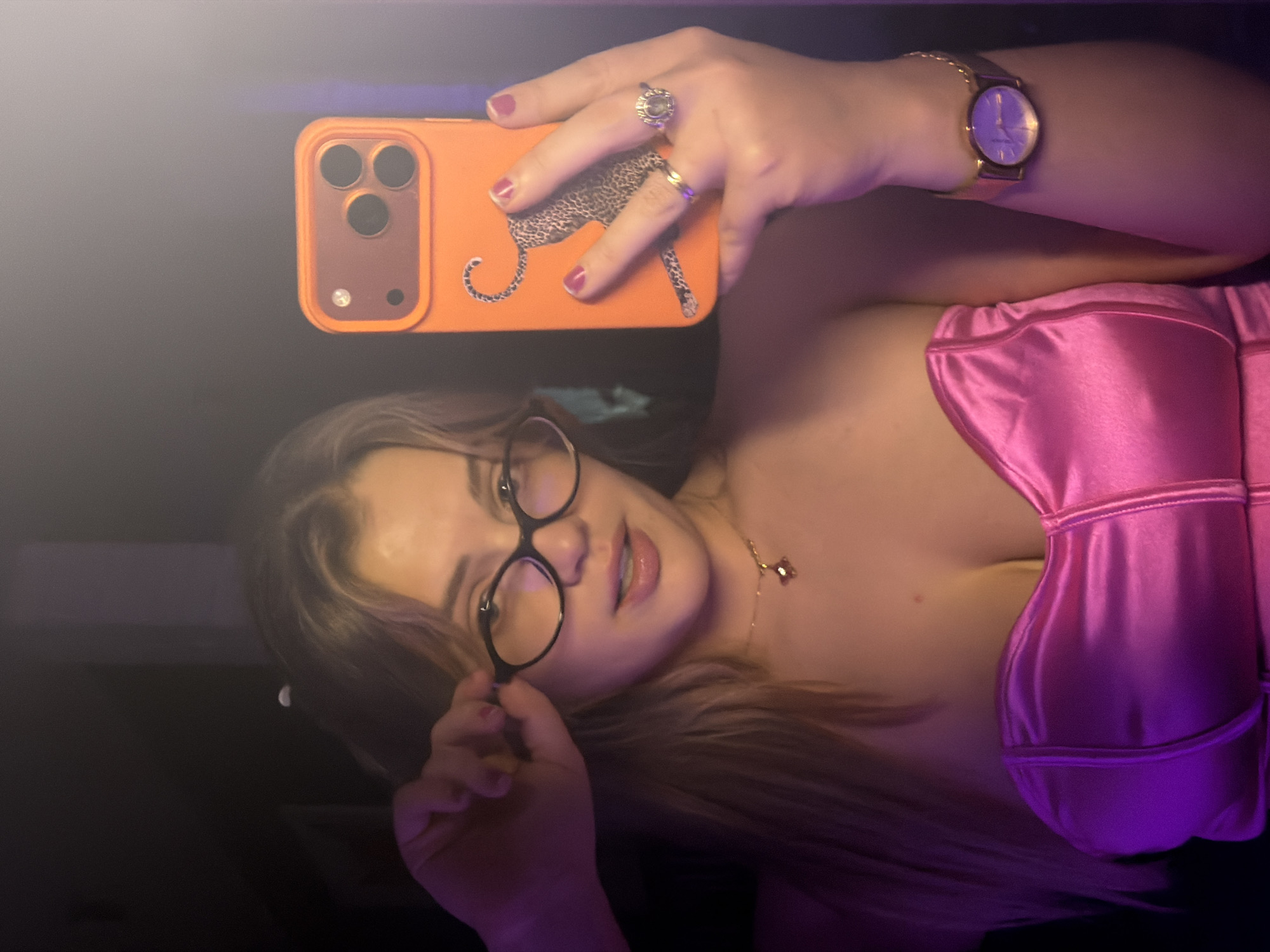 A woman takes a selfie with her smartphone. She is wearing a pink corset top, glasses, a watch, rings, and a necklace. The smartphone has an orange case with a cheetah design. The background is dark, with some purple and yellow lighting. The location is Большая Шильна, Russia.