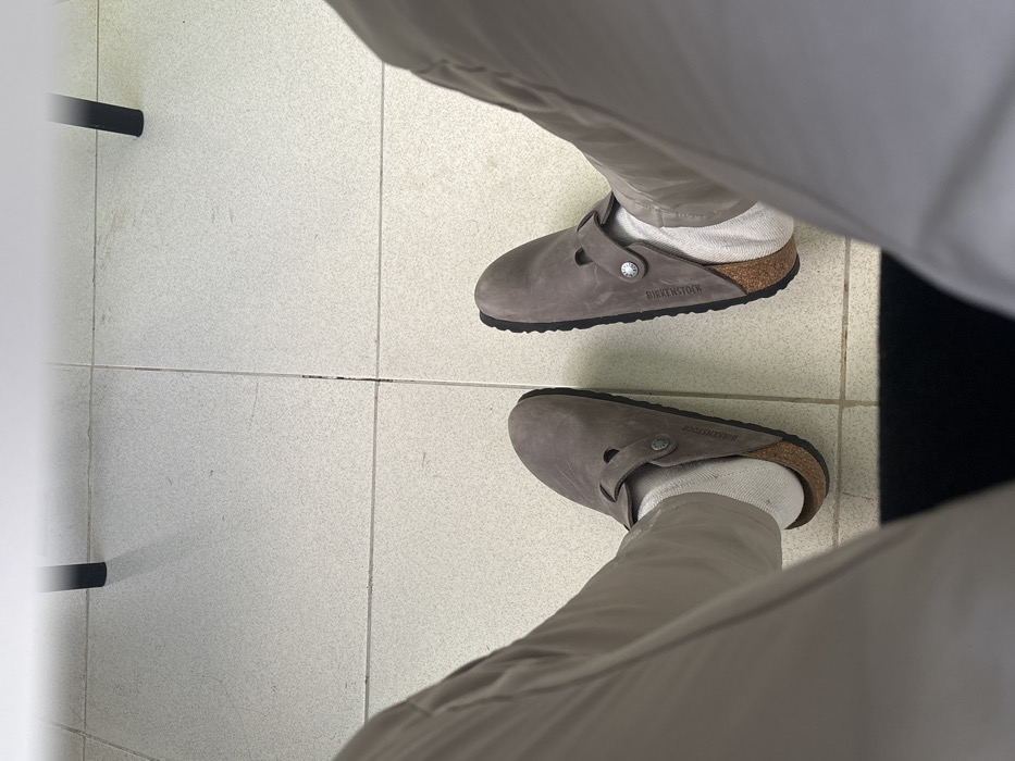 The scene, located in Chablekal, Mexico, is depicted from a first-person, downward-looking perspective, focusing on an individual's lower legs and feet. The subject is wearing light beige trousers, white ankle-height socks, and a pair of gray Birkenstock Boston clogs. Each clog features a single gray strap with a silver-toned buckle over the instep, a prominent cork midsole with "BIRKENSTOCK" branding visible on the left shoe, and a black outsole. The feet rest on a light-colored tiled floor with dark grout lines, which exhibits minor surface scuffs and debris. In the upper portion of the frame, two black metal furniture legs are visible, casting shadows. A dark, indistinct object partially obstructs the immediate foreground.