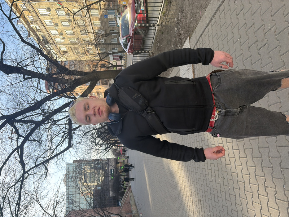 A male individual with short, bleached blonde hair, light eyes, and a neutral expression stands facing forward on a grey paved pedestrian walkway