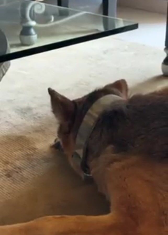 dog, appearing to be a German Shepherd mix, lying on a light-colored rug underneath a glass-topped coffee table. The dog is wearing a patterned collar and its head is initially down. It lifts its head and looks towards the camera. Someone is speaking to the dog in Spanish, telling it that he is leaving but Dexter is not going.