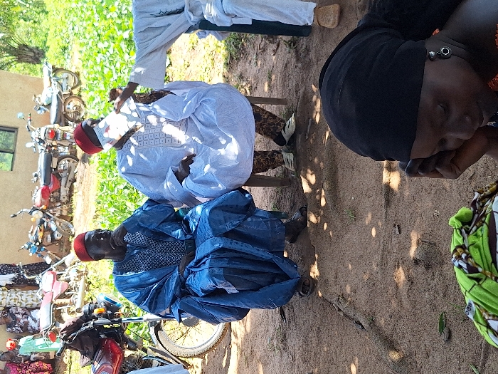 The image depicts an outdoor gathering in Unguwan Rimi, Nigeria, under bright daylight