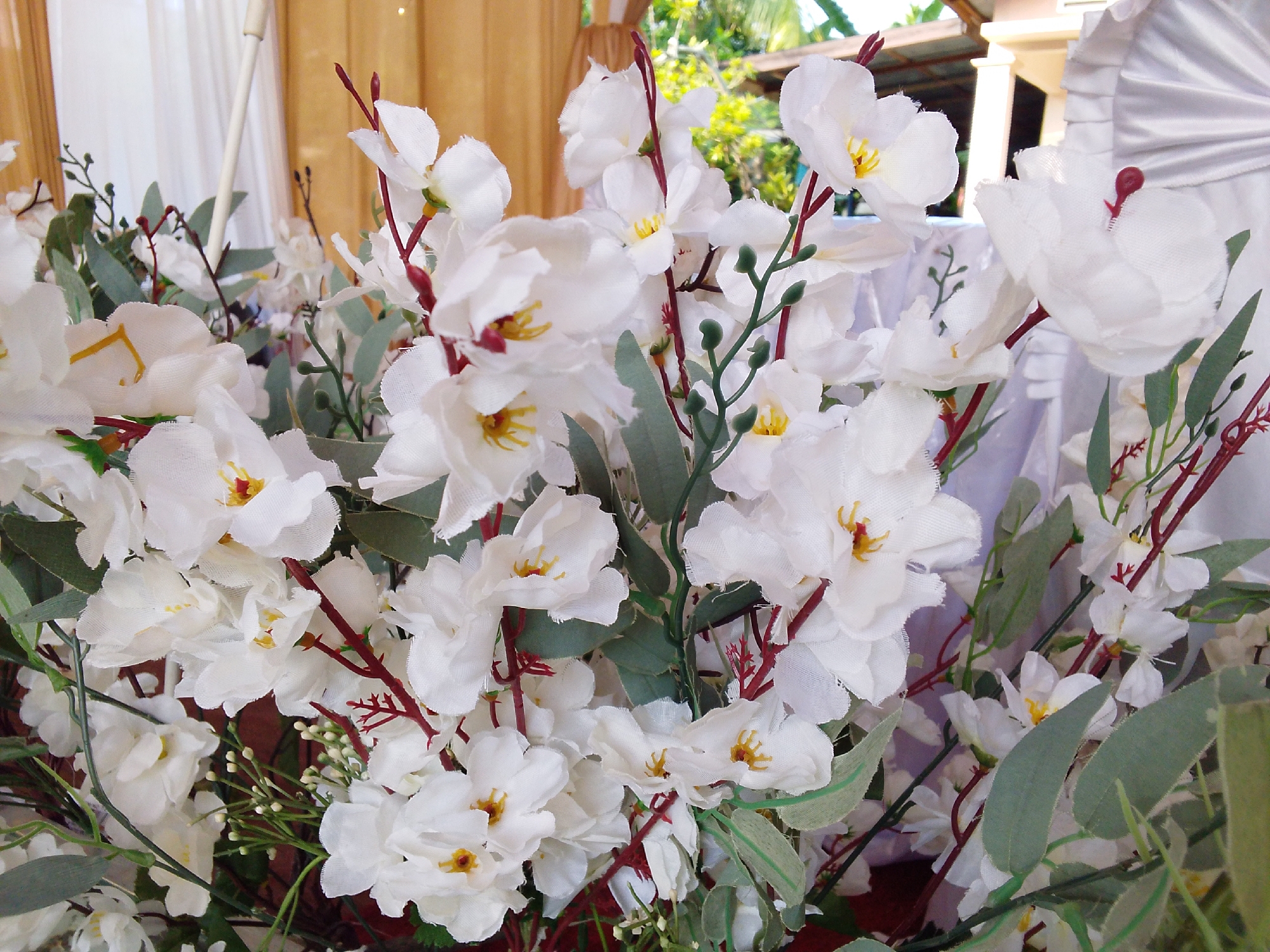 dense arrangement of white flowers with yellow centers, interspersed with green and brown foliage. The flowers appear to be artificial, likely used for decoration. In the background, blurred elements suggest an outdoor setting in Gampongjawa, Indonesia, with glimpses of a building or structure draped with white fabric. The overall scene suggests a festive occasion.