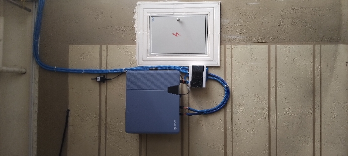 A blue battery unit is mounted on a wall with a metal-framed access panel above. The panel features a red lightning bolt symbol. Blue cables connect the battery to the panel and a black device to the right. The wall is textured with alternating light and dark sections, with a lighter section behind the battery and panel. A pipe and cables are visible on the left side of the wall.