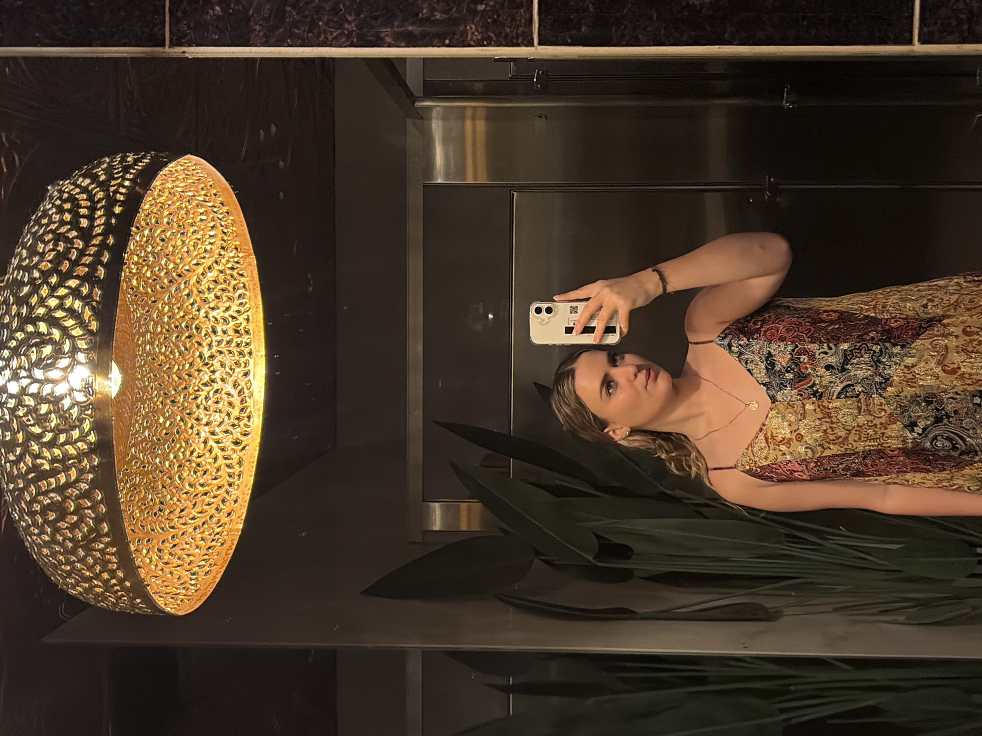 woman taking a selfie in front of a mirror. She is holding a white smartphone in her right hand. Her left arm is partially visible, adorned with a bracelet. She wears a patterned dress with a spaghetti strap. In the background is a decorative lamp composed of a metalwork design with a lightbulb inside. There are green plants arranged near the surface she is posing near. The reflection in the mirror indicates a room with dark, possibly tiled, wall panels and a metallic cabinet. While location details are not explicitly visible, the request suggests this image was taken in Coral Gables, United States of America. The image provides no visual verification of this.