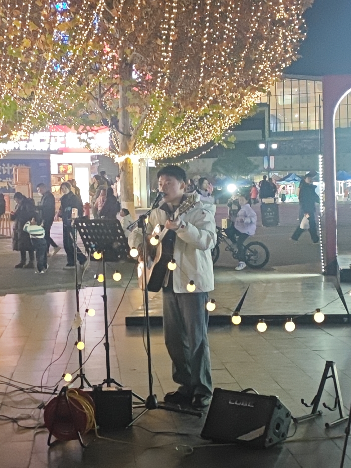 The scene depicts a nighttime outdoor public event in the Chongqing High-tech Zone, China. The central subject is an East Asian male street performer, appearing to be in his late teens or early twenties, dressed in a light-colored hooded jacket and dark trousers. He stands on a paved surface, actively singing into a microphone positioned on a stand while simultaneously playing an acoustic guitar. A music stand holding what appears to be sheet music or lyrics is situated to his left. His performance setup includes two ground-level audio amplifiers, one notably branded "CUBE," and an orange cable reel with associated wiring visible on the ground. The immediate area around the performer is illuminated by a string of large, round, warm white bulbs hanging vertically and horizontally. The environment is characterized by large trees overhead, heavily adorned with a dense canopy of numerous small, warm white string lights, casting a festive glow. In the mid-ground and background, multiple pedestrians of varying ages are observed walking and congregating, indicating a lively atmosphere. A child on a bicycle is visible to the right of the performer. Structures in the background include multi-story buildings with illuminated windows and a partially visible arched entrance on the far right. A red fire hydrant is discernible in the left background. The overall impression is a bustling public square or pedestrian street hosting entertainment under festive lighting.