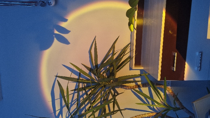 An indoor scene in Beloslav, Bulgaria, displays a large potted plant, likely a Yucca, with numerous long, pointed green leaves, positioned on the left and center. A circular projection of light, exhibiting a rainbow-like gradient of warm yellow, orange, and red hues, is cast onto a light-colored wall in the background. The projected light illuminates the upper portion of the plant and the top surface of a piece of furniture, which appears to be a two-drawer cabinet or nightstand with a light-colored top and dark-colored drawers featuring metallic pulls, located in the lower right quadrant. Distinct shadows of the plant's leaves are prominently visible on the wall and the furniture. In the upper right, a secondary shadow resembling foliage is present near hanging decorative elements, which include a white spherical object with markings and several metallic items. No individuals are present.