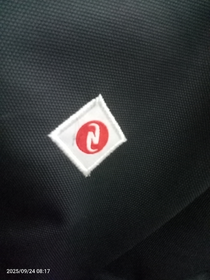 A close-up photograph captures a section of black woven textile material, likely synthetic. A white, diamond-shaped embroidered patch is centrally affixed to the material. The patch features a red, stylized letter 'N' or similar symbol, centrally enclosed within a red oval. No individuals are present, and no actions or interactions are depicted. The scene is identified as Quebrada del Medio, Venezuela. A digital watermark in the lower-left corner indicates a capture date and time of 2025/09/24 08:17.