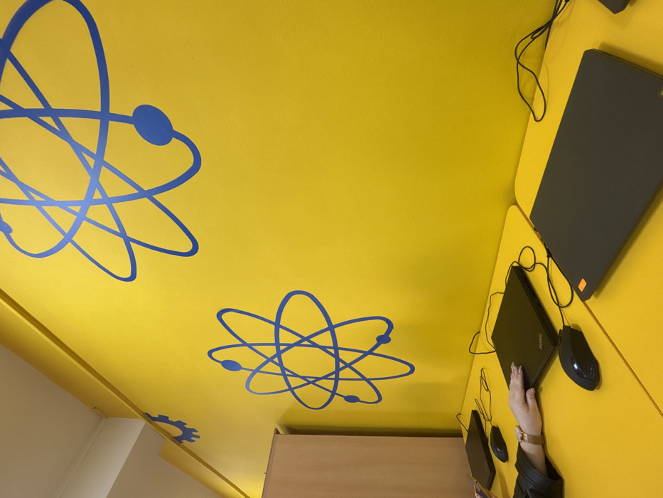 The scene is an interior view of a room, described as being in Kardzhali, Bulgaria. The walls are painted bright yellow and feature blue graphics depicting multiple atomic models and a partial gear symbol. A white ceiling is visible overhead, and a light-colored wooden cabinet or partition stands to the far left. The foreground consists of multiple yellow desks, upon which several workstations are arranged. Each visible workstation includes a closed black laptop and a black wired computer mouse, with associated cables. One laptop is branded "ThinkPad," and another features a small orange rectangular sticker on its lid. A human left hand, adorned with a rose gold wristwatch, is positioned resting on the lid of a closed laptop on the left side of the frame.